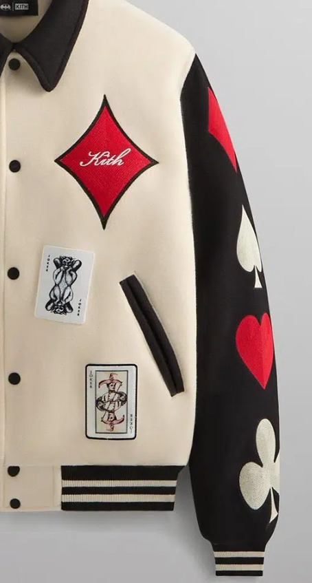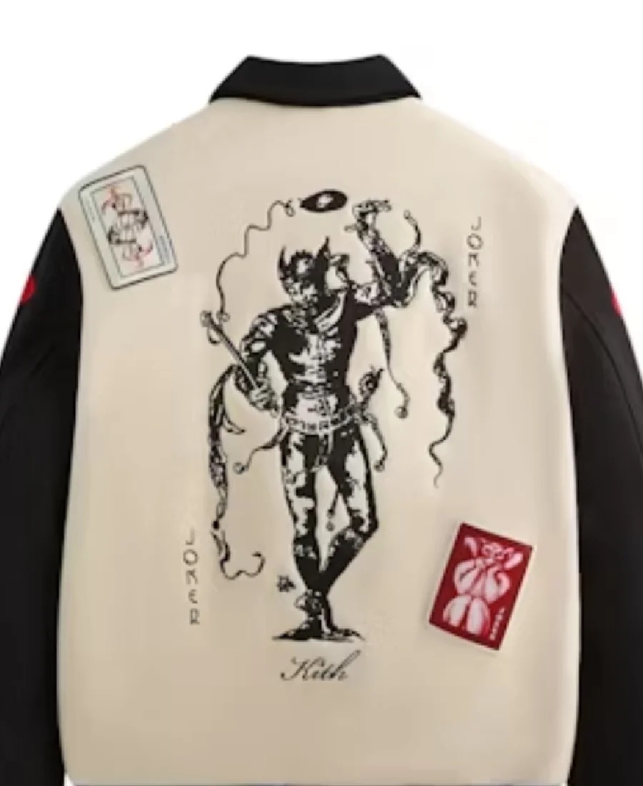 This stunning Joker wool coaches jacket is crafted from heavyweight 900GSM double-face wool in a sophisticated Sandrift color, featuring a matte satin lining and striped rib at the neckline, cuffs, and hem . The Kith x Batman collab piece is distinguished by custom embroidered Joker artwork on the front and back, complete with playing card-inspired patchwork throughout—a direct nod to the Clown Prince of Crime’s comic book origins . Kith-branded snap closures and contrast slanted welt pockets complete this limited edition design .