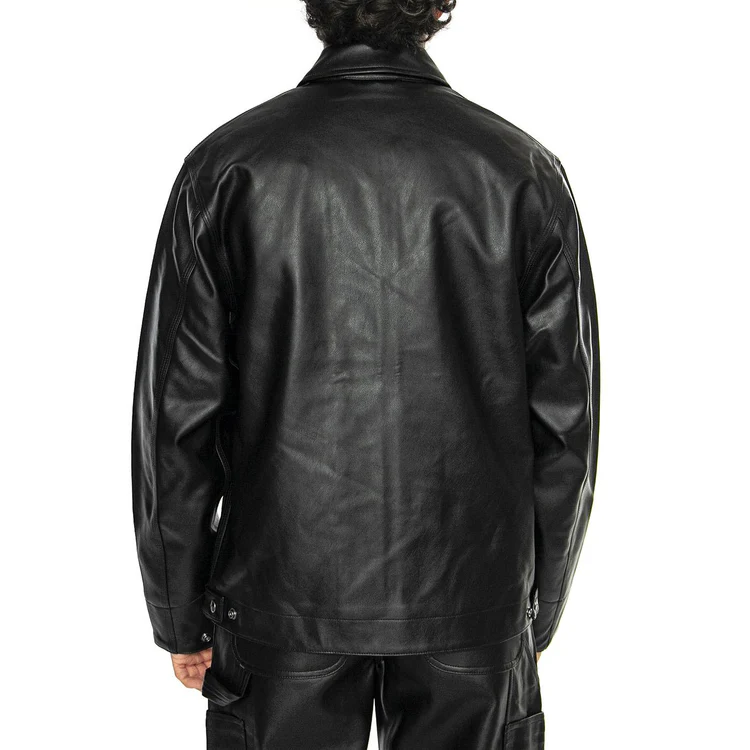 La versione in Carhartt WIP nera trasforma la classica giacca da lavoro in un capo versatile per la città. Realizzata in similpelle durevole, offre l’estetica ricca e strutturata del cuoio con una manutenzione semplificata, risultando la perfetta black workwear jacket per l’uso quotidiano. Il design mantiene i dettagli originali che definiscono il modello Detroit: il taglio dritto, il colletto a punta, le quattro tasche utility con patta, e la chiusura con bottoni a pressione. Questi elementi rendono questa Carhartt Detroit leather (style) giacca un’icona riconoscibile.