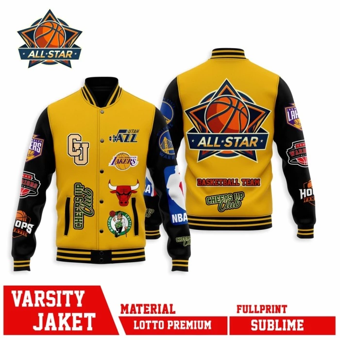 Keywords: Basketball All-Star Yellow Varsity Jacket, New York, MLB, NBA, sporty style, urban flair, iconic logos, vintage charm, modern aesthetics, fashion statement.